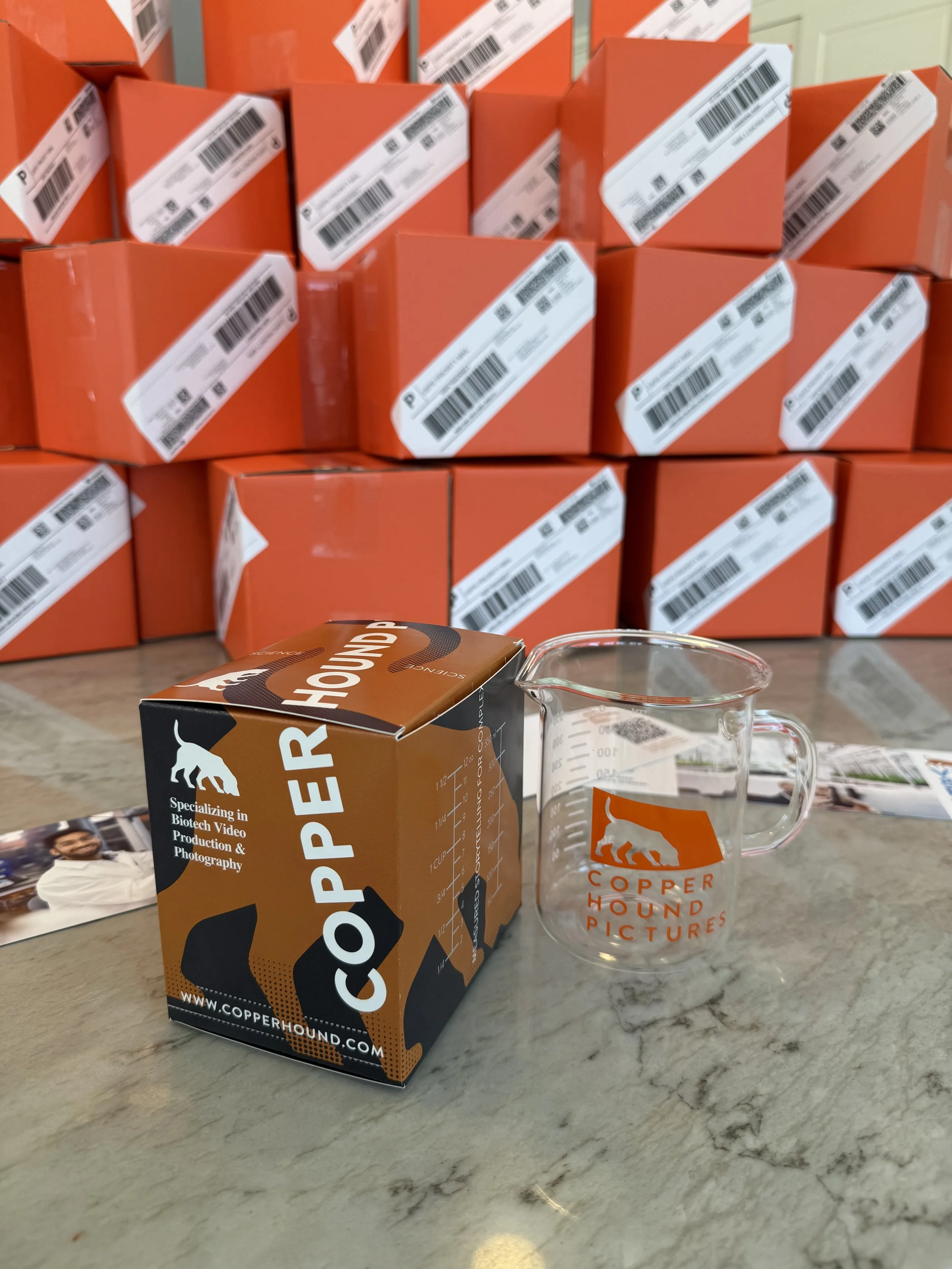 Over the past couple of weeks, nearly 100 small boxes have been making their way to biotech companies and agency partners. Inside each one is a simple item: a laboratory beaker with our Copper Hound Pictures logo.